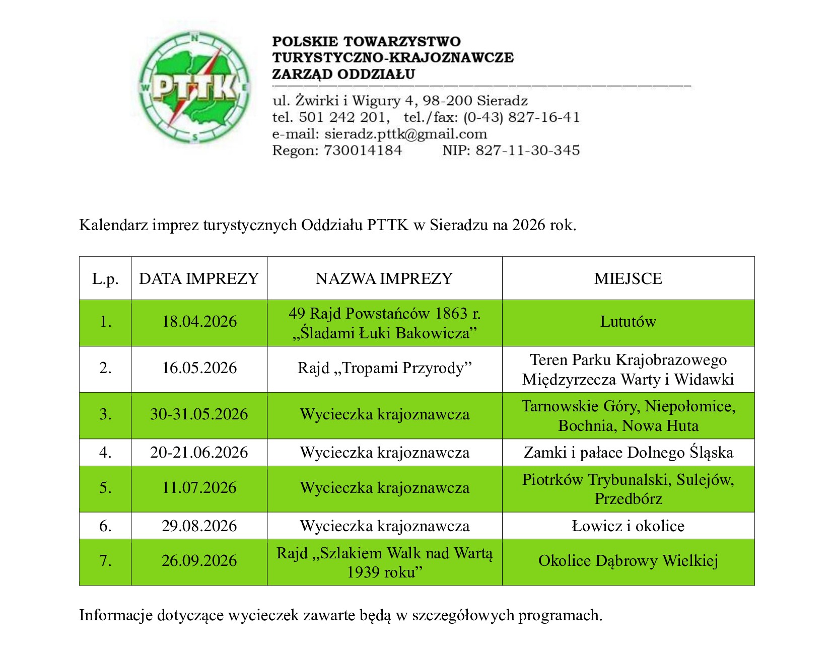 Kalendarz imprez turystycznych Oddziału PTTK w Sieradzu na 2026 rok.